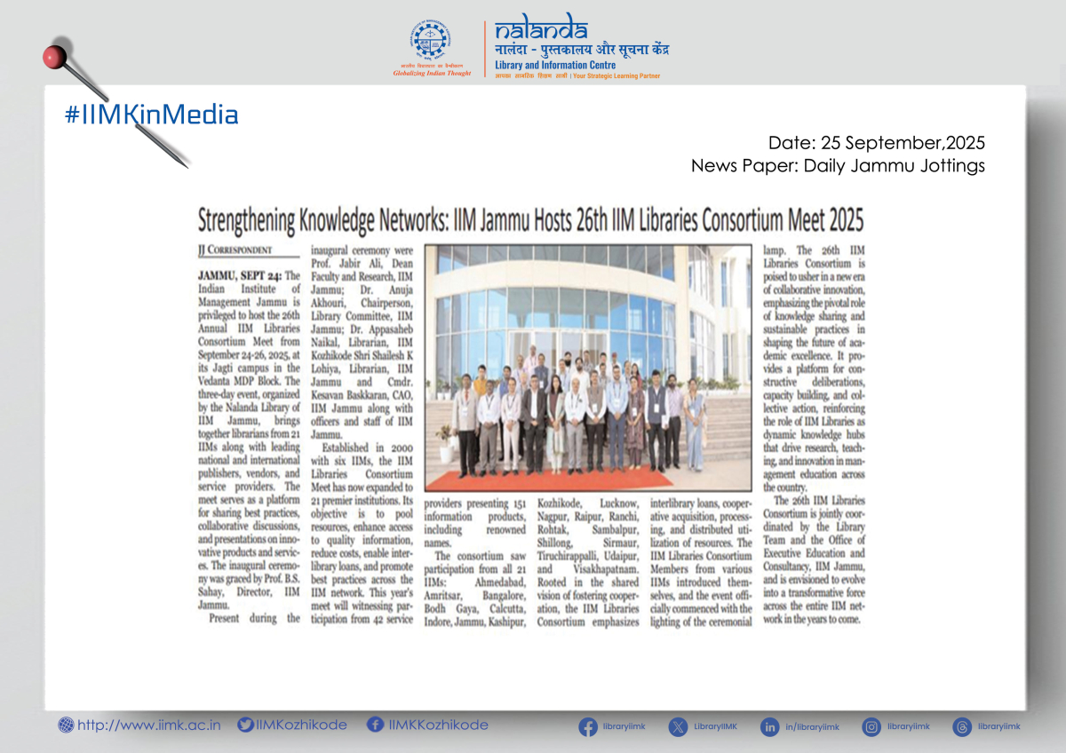 The Indian Institute of Management Jammu is privileged to host the 26th IIM Libraries Consortium Meet from September 24–26, 2025, at its Jagti campus in the Vedanta MDP Block. The three-day event, organized by the Nalanda Library of IIM Jammu, brings together librarians from 21 IIMs along with leading national and international publishers, vendors, and service providers. The IIM Libraries Consortium meet serves as a platform for sharing best practices, collaborative discussions, and presentations on innovative products and services. The inaugural ceremony was graced by Prof. B.S. Sahay, Director, IIM Jammu.