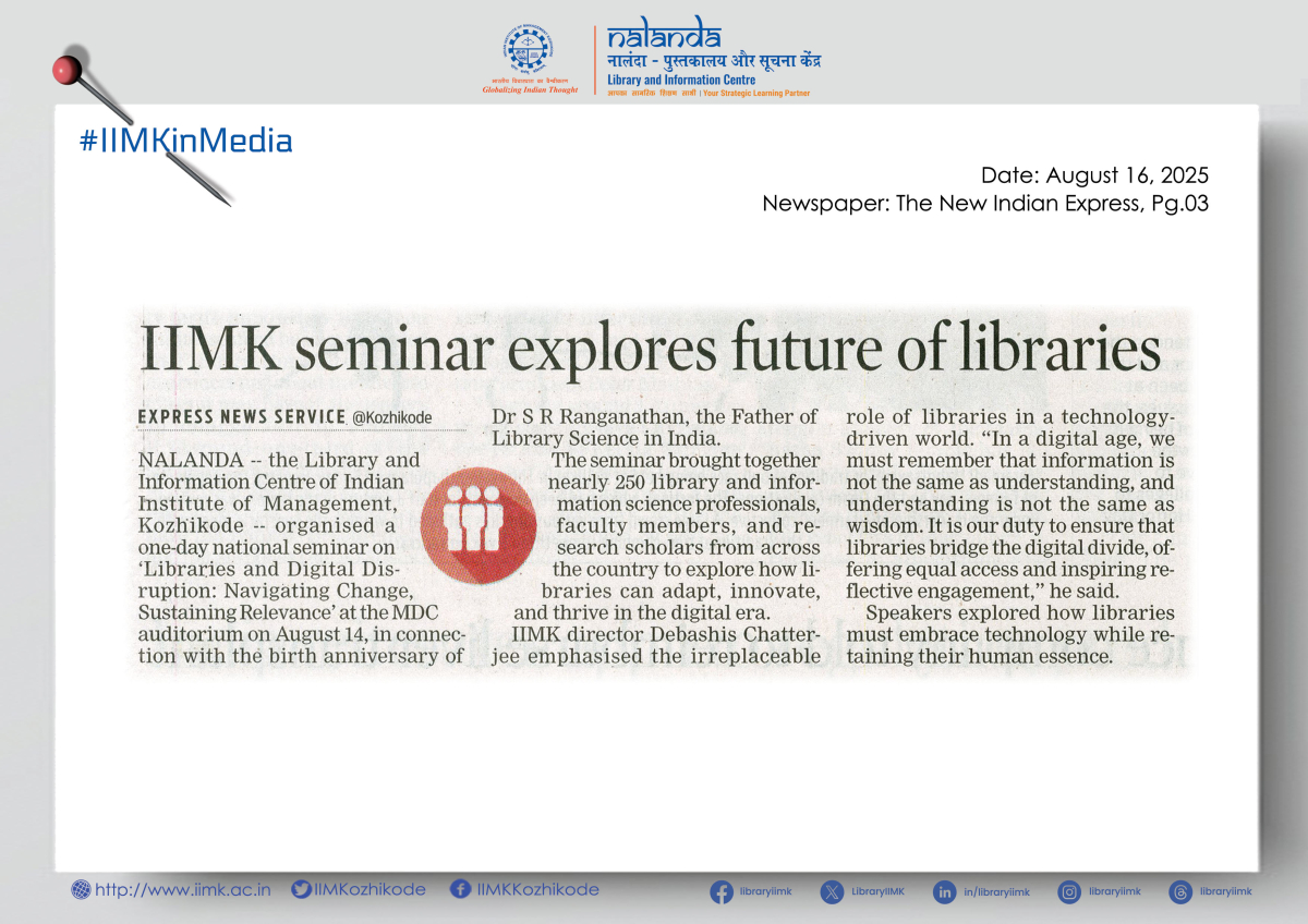 Nalanda – the Library and Information Centre of IIM Kozhikode – organised a One-Day National Seminar on “Libraries and Digital Disruption: Navigating Change, Sustaining Relevance” at the MDC Auditorium today, in honour of the birth anniversary of Dr. S. R. Ranganathan, the Father of Library Science in India.