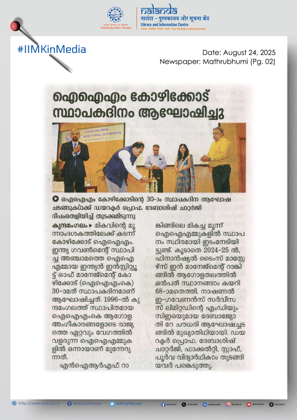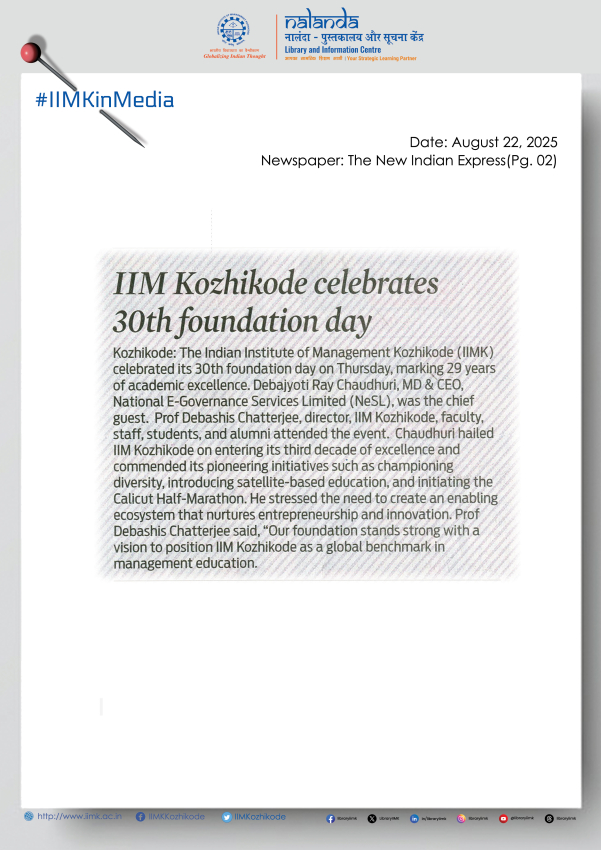 he Indian Institute of Management Kozhikode (IIMK), the fifth IIM established by the Government of India, celebrated its 30th Foundation Day on Thursday, marking 29 years of academic excellence. The occasion was graced by Mr. Debajyoti Ray Chaudhuri, MD & CEO, National E-Governance Services Limited (NeSL), who was the Chief Guest, along with Prof. Debashis Chatterjee, Director, IIM Kozhikode, faculty, staff, students, and alumni.