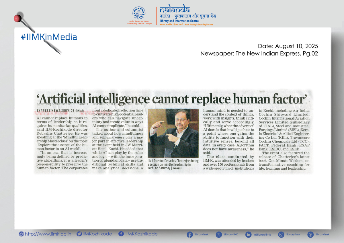 AI cannot replace humans in terms of leadership as it requires humanitarian qualities, said IIM-Kozhikode director Debashis Chatterjee. He was speaking at the ‘Mindful Leadership Masterclass’ on the topic ‘Explore the essence of the human factor in an AI world’.