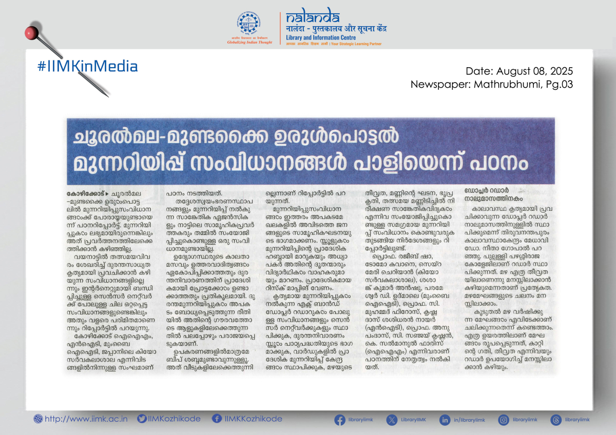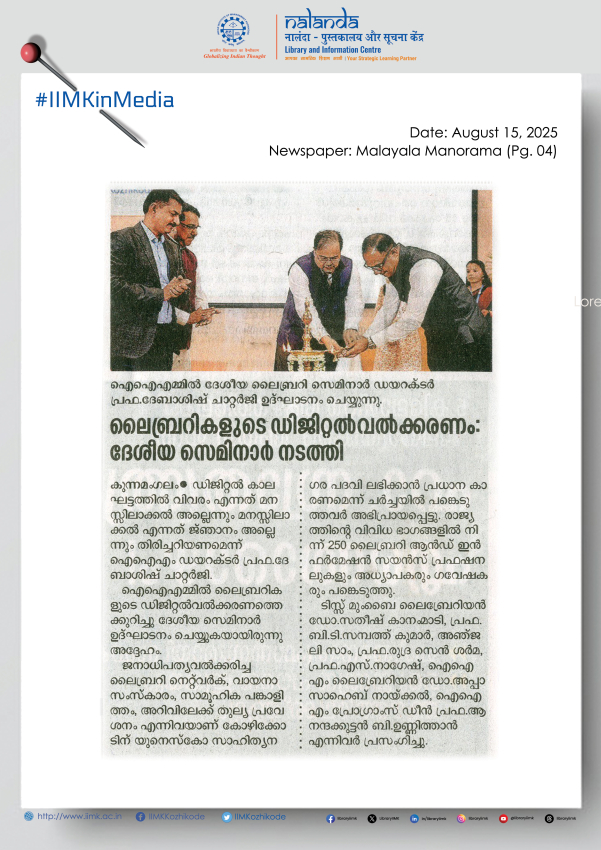 Nalanda – the Library and Information Centre of IIM Kozhikode – organised a One-Day National Seminar on “Libraries and Digital Disruption: Navigating Change, Sustaining Relevance” at the MDC Auditorium today, in honour of the birth anniversary of Dr. S. R. Ranganathan, the Father of Library Science in India.