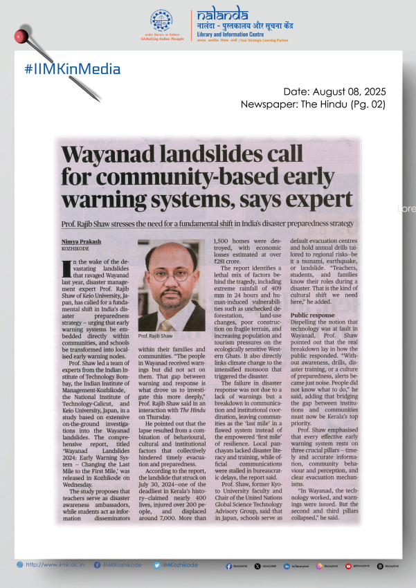 In the wake of the devastating landslides that ravaged Wayanad last year, disaster management expert Prof. Rajib Shaw of Keio University, Japan, has called for a fundamental shift in India’s disaster preparedness strategy — urging that early warning systems be embedded directly within communities, and schools be transformed into localised early warning nodes.
