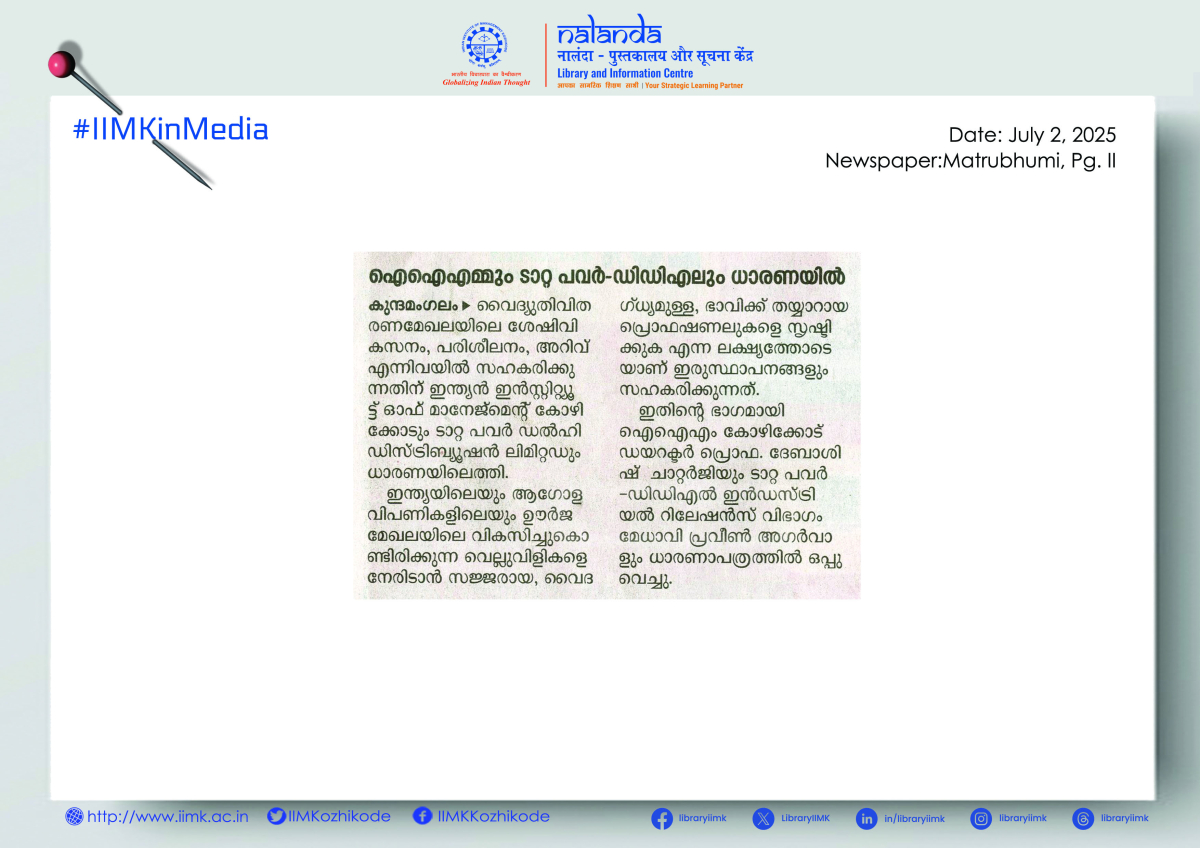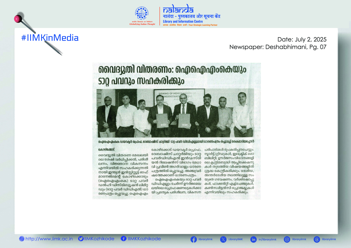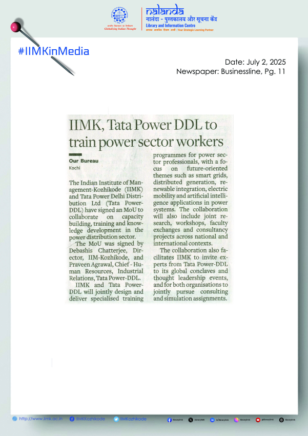 The Indian Institute of Management Kozhikode (IIMK) and Tata Power Delhi Distribution Limited (Tata Power-DDL) have signed a memorandum of understanding (MoU) to collaborate on capacity building, training, and knowledge development in the power distribution sector.