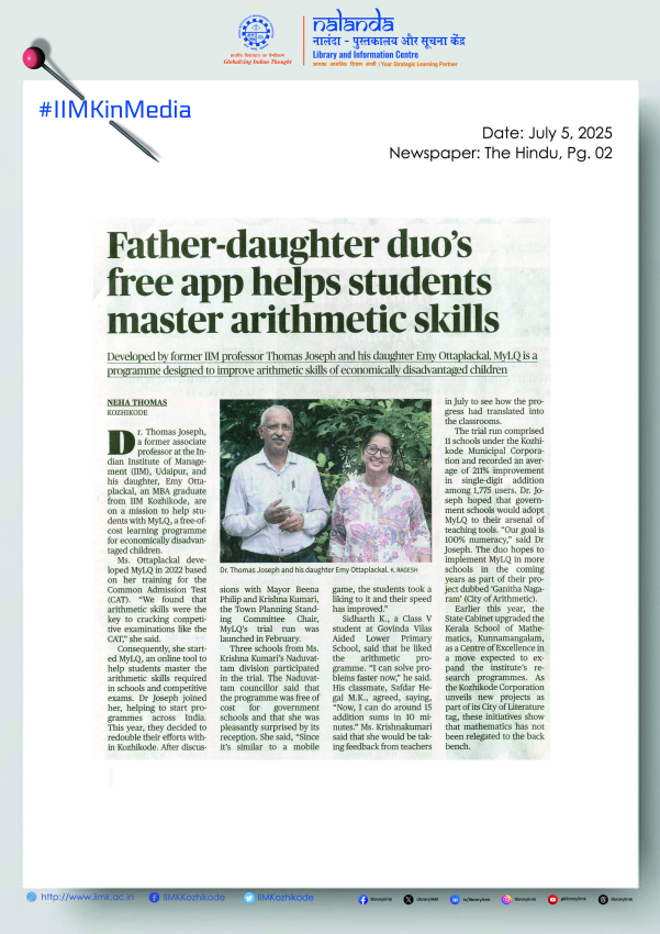 Dr. Thomas Joseph, a former associate professor at the Indian Institute of Management (IIM), Udaipur, and his daughter, Emy Ottaplackal, an MBA graduate from IIM Kozhikode, are on a mission to help students with MyLQ, a free-of-cost learning programme for economically disadvantaged children.