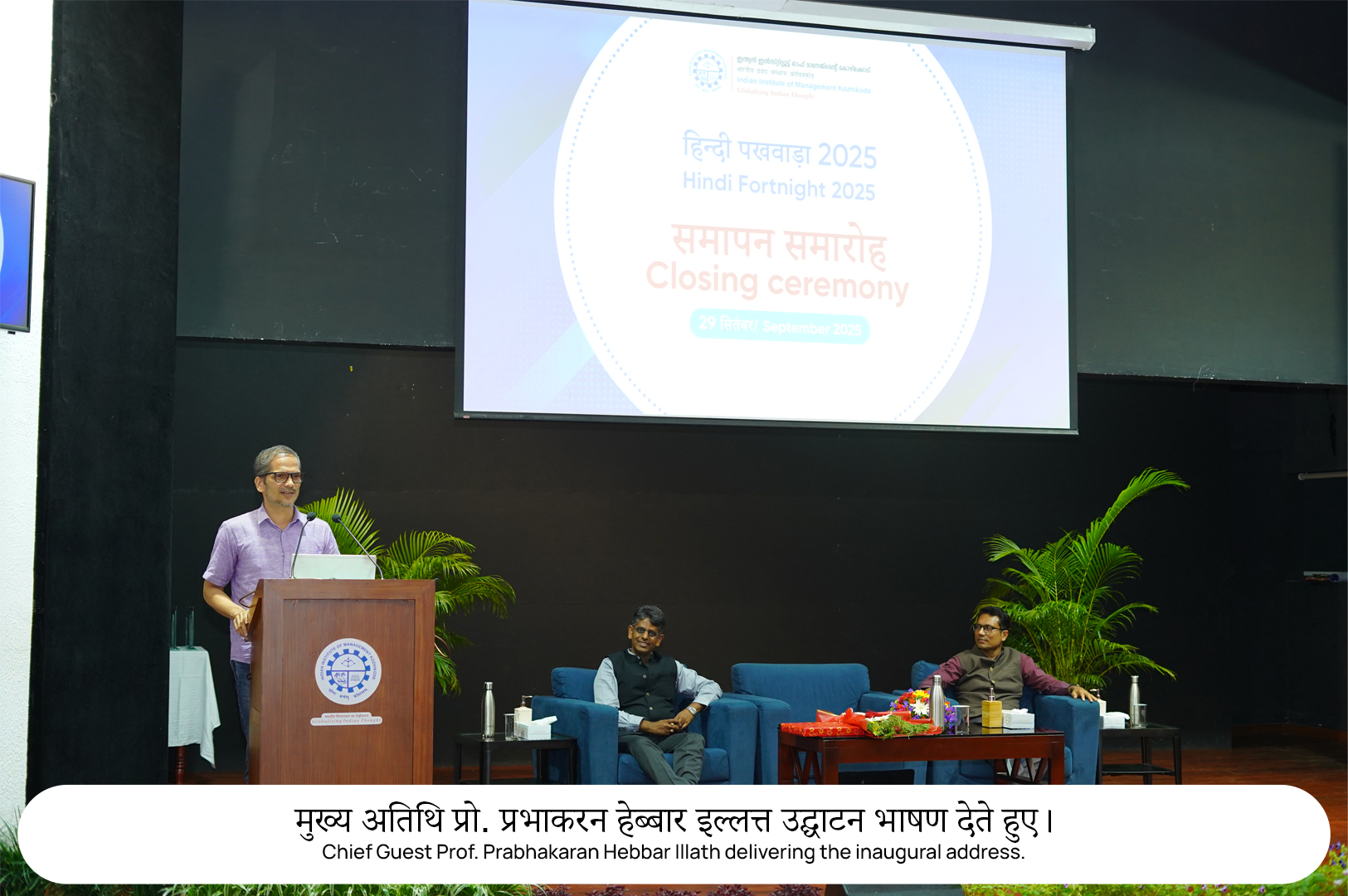 आईआईएमके में 14 सितंबर 2023 से हिंदी पखवाड़ा समारोह मनाया गया। इस दौरान संकाय, कर्मचारियों और छात्रों के लिए विभिन्न प्रतियोगिताओं का आयोजन किया गया। श्रीमती बीना राजलक्ष्मी, वरिष्ठ अनुवाद अधिकारी, आयकर कार्यालय, कोषिक्कोड द्वारा एक हिंदी कार्यशाला का आयोजन किया गया। इस साल का हिंदी पखवाड़ा समापन समारोह गुरुकुल में आयोजित किया गया था। केरल केंद्रीय विश्वविद्यालय, कासरगोड के हिंदी विभाग में सहायक प्रोफेसर और महिला अध्ययन केंद्र की समन्वयक डॉ. सुप्रिया पी. इस अवसर पर मुख्य अतिथि के रूप में उपस्थित रहीं। इस समारोह में, प्रतियोगिताओं के विजेताओं को पुरस्कार वितरित किए गए, डॉ. सुप्रिया पी द्वारा भाषण दिया गया और पखवाड़े के आधिकारिक समापन पर एक शानदार सांस्कृतिक कार्यक्रम आयोजित किया गया।