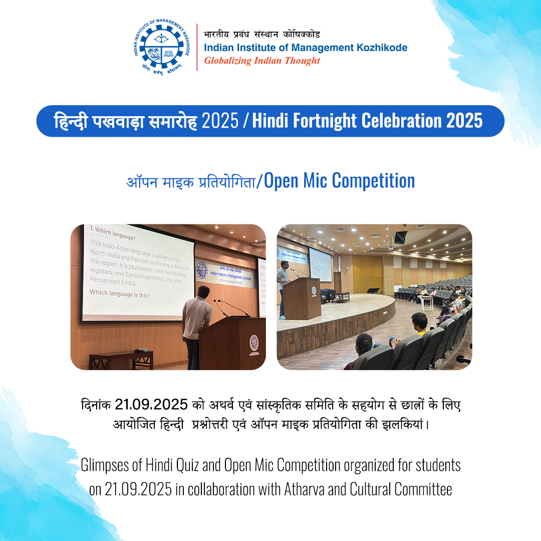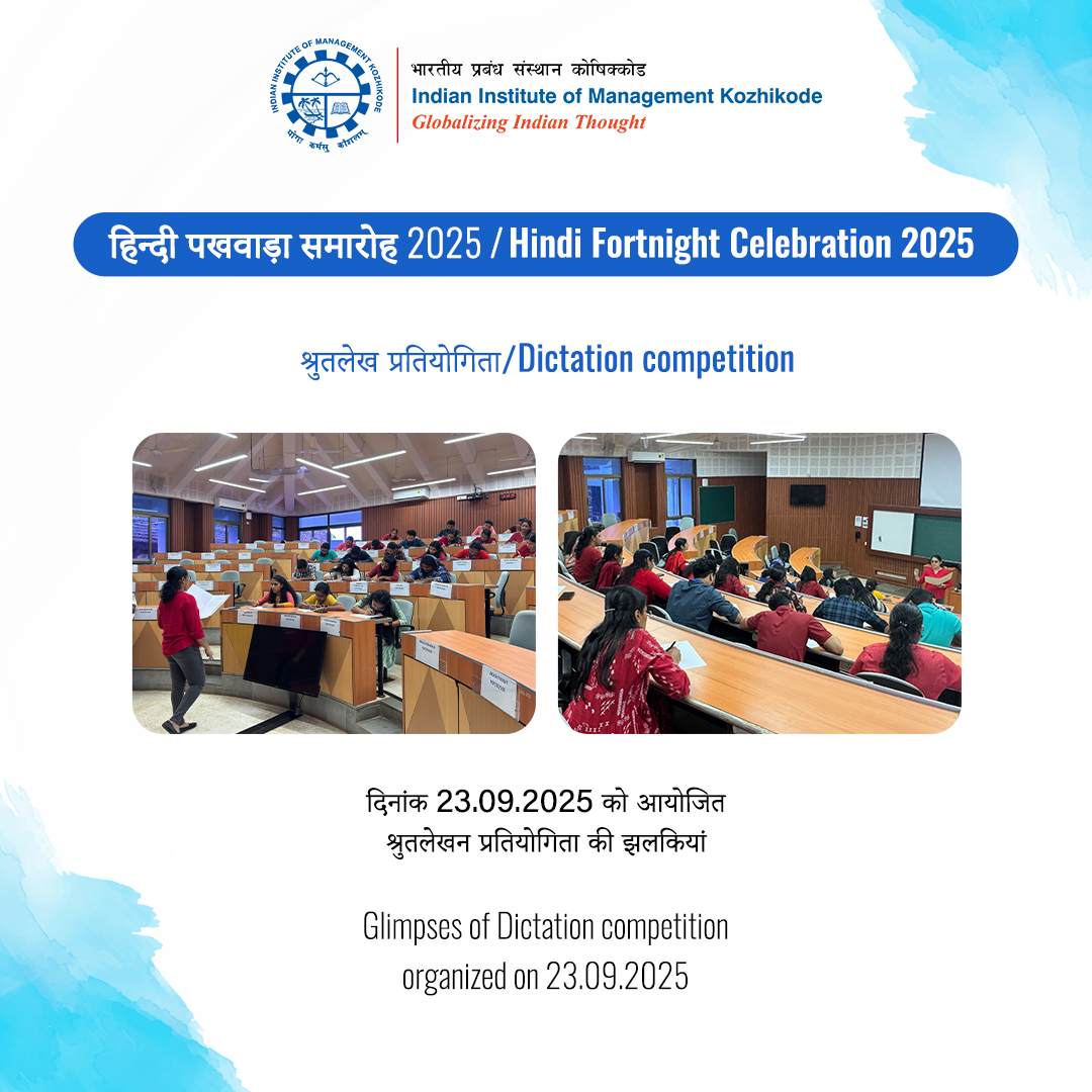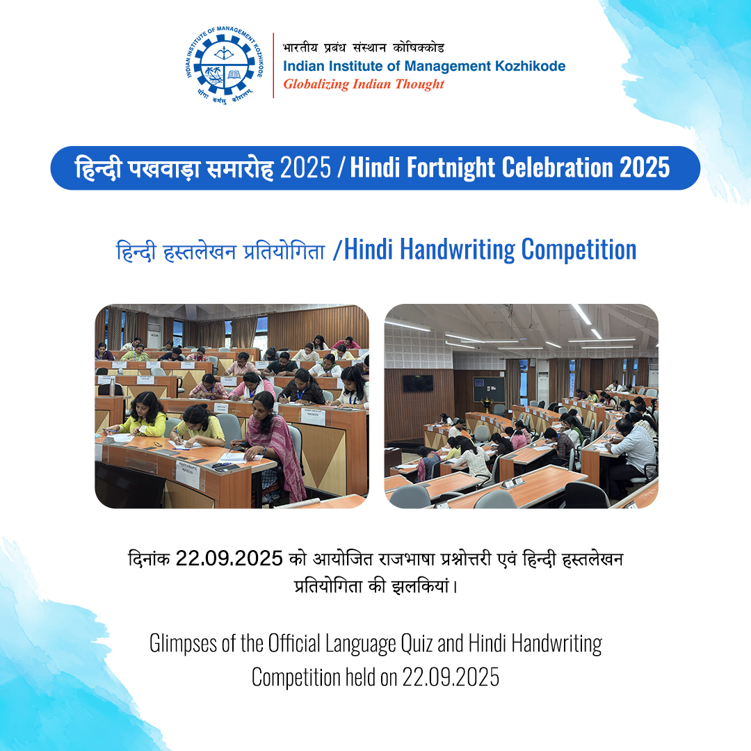 आईआईएम कोषिक्कोड में 15.09.2025 से 29.09.2025 तक हिन्दी पखवाड़ा मनाया गया। इस पखवाड़े के दौरान कैप्शन लेखन, नारा लेखन, लघु निबंध लेखन, श्रुतलेख, हस्तलेखन और चित्रकला से लेकर उत्साहवर्धक फिल्मी गीत प्रतियोगिता तक विभिन्न प्रतियोगिताएँ ऑनलाइन और ऑफलाइन रूप में आयोजित की गईं।