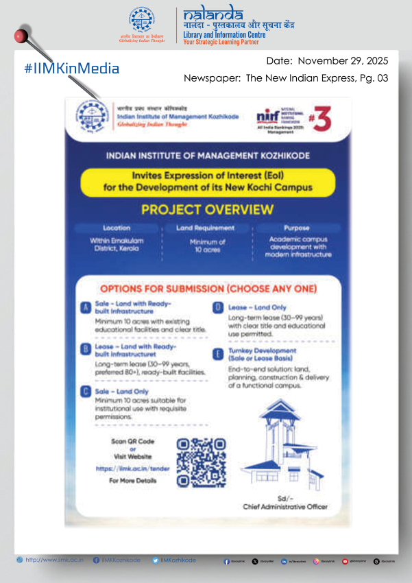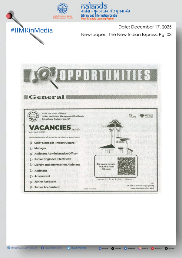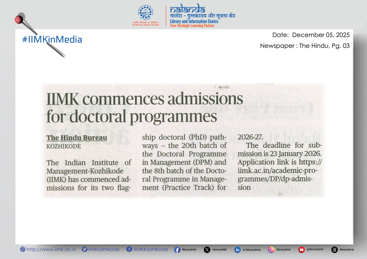 The Indian Institute of Management-Kozhikode (IIMK) has commenced admissions for its two flagship doctoral (PhD) pathways — the 20th batch of the Doctoral Programme in Management (DPM) and the 8th batch of the Doctoral Programme in Management (Practice Track) for 2026-27.
