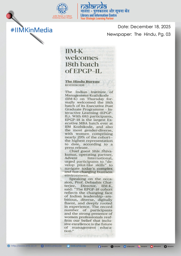 The Indian Institute of Management-Kozhikode (IIM-K) on Thursday formally welcomed the 18th batch of its Executive Post Graduate Programme – Interactive Learning (EPGP–IL).