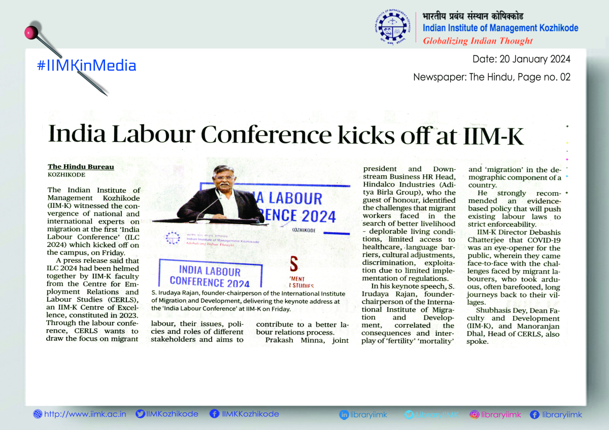 The Indian Institute of Management Kozhikode (IIMK) witnessed the convergence of national and international experts on Migration at the First ‘India Labour Conference’ (ILC 2024) which kicked-off here in the campus, today.