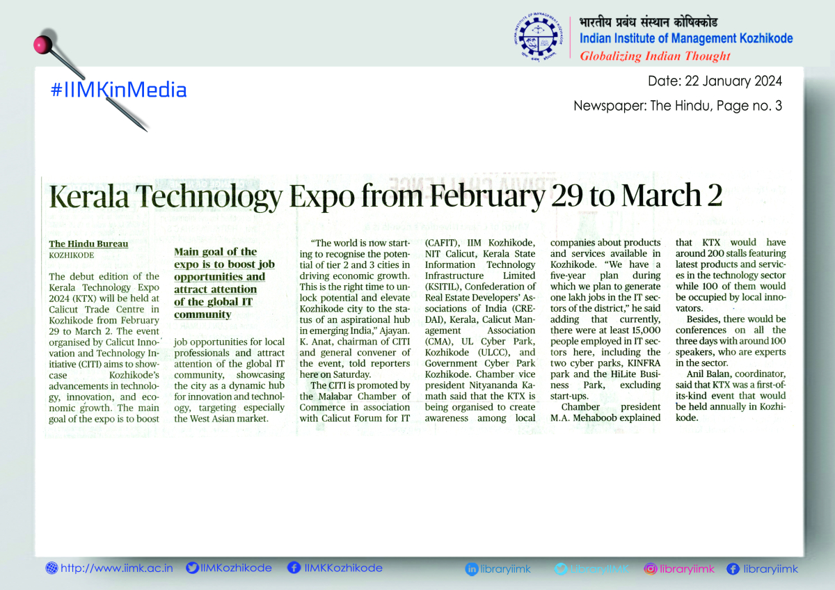 The debut edition of Kerala Technology Expo 2024(KTX) will be held at Calicut Trade Centre in Kozhikode from February 29 to March 2.