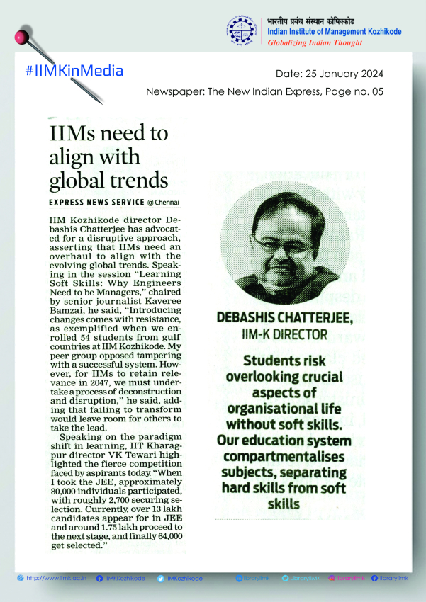 IIK Kozhikode director Debashis Chatterjee has advocated for a disruptive approach, asserting that IIMs need an overhaul to align with the evolving global trends.