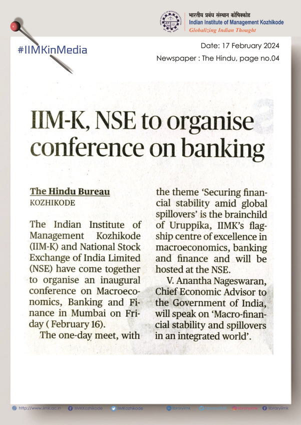 The Indian Institute of Management Kozhikode (IIMK) and the country’s leading stock exchange National Stock Exchange of India Limited (NSE) have come together to organise an inaugural conference on Macroeconomics, Banking and Finance in Mumbai on Friday ( February 16).