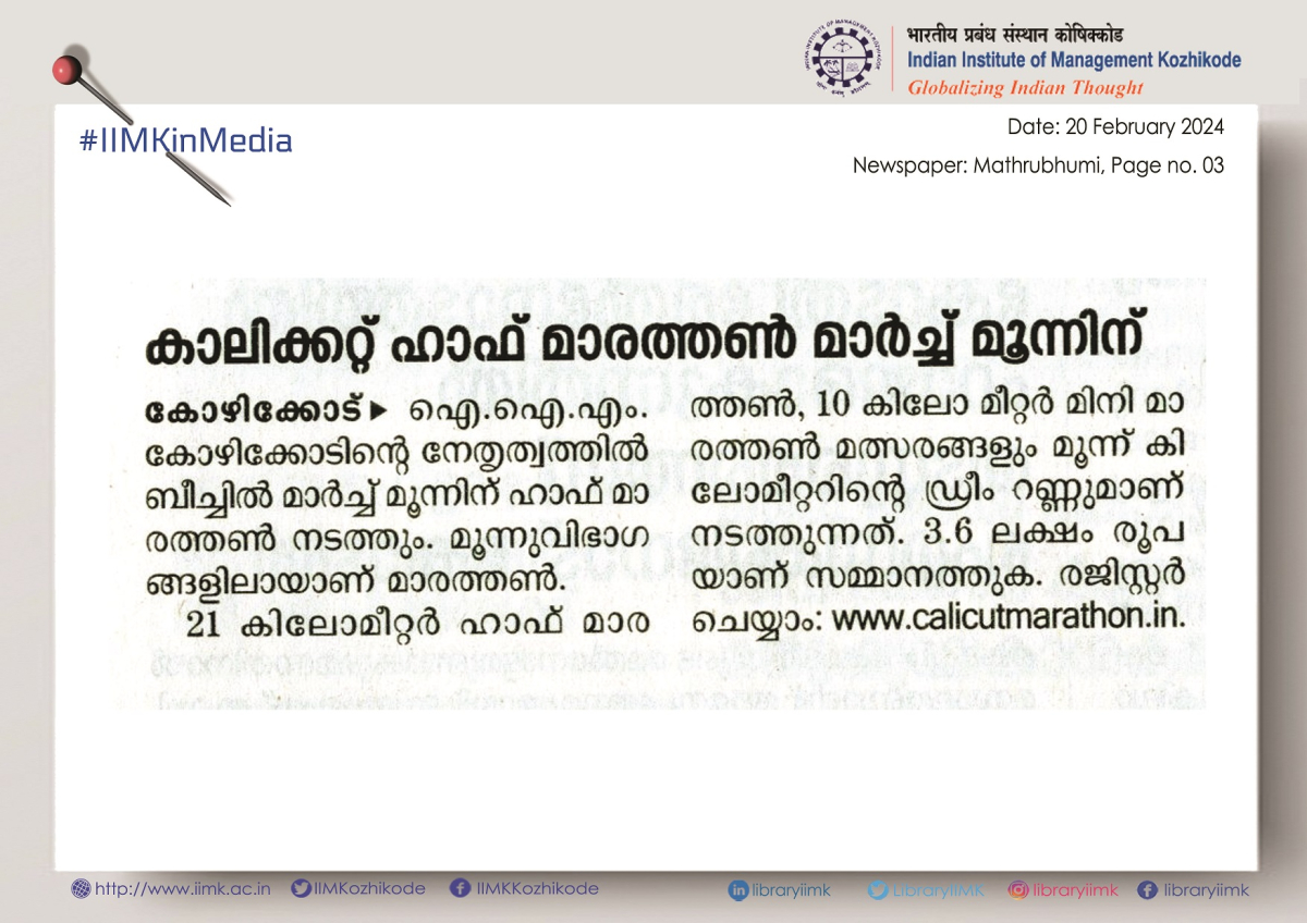 Indian Institute of Management-Kozhikode, which has launched the 14th edition of the Peekay Steel Calicut Half marathon, is now open for registration.