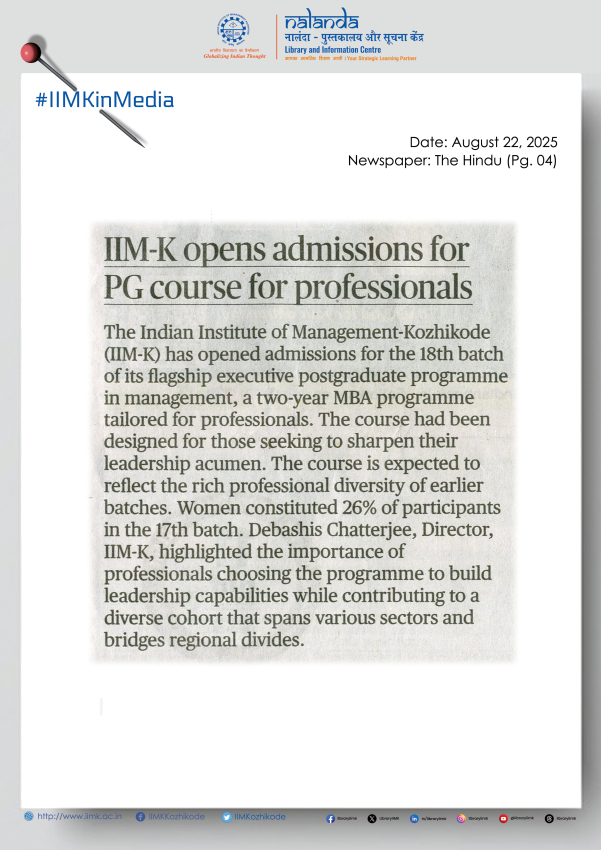 The Indian Institute of Management-Kozhikode (IIM-K) has opened admissions for the 18th batch of its flagship executive postgraduate programme in management, a two-year MBA programme tailored for professionals. A release said here on Thursday that the course had been designed for those seeking to sharpen their leadership acumen.