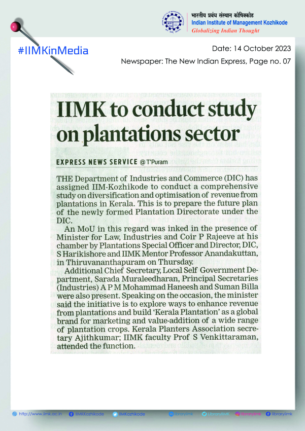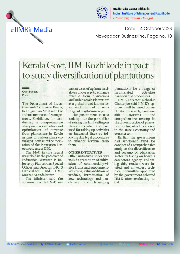 The Department of Industries and Commerce (DIC) in Kerala has signed an MoU with the Indian Institute of Management Kozhikode (IIMK) for conduct of a comprehensive study on diversification and optimisation of revenue from plantations in Kerala as part of various plans envisaged in the wake of formation of the Plantation Directorate under the DIC.