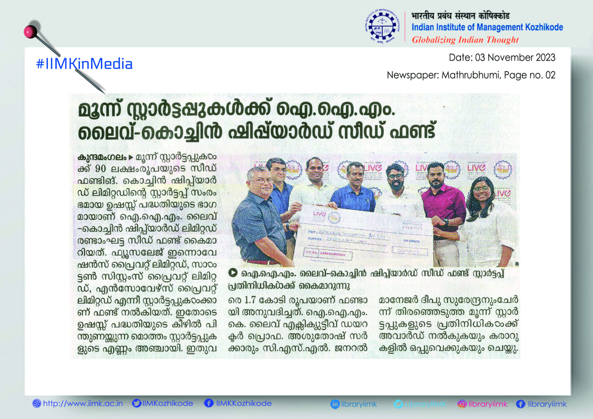 The Laboratory for Innovation Venturing and Entrepreneurship (LIVE) of the Indian Institute of Management-Kozhikode (IIM-K) and Cochin Shipyard Limited (CSL) have awarded seed fund worth ?80 lakh to two promising start-ups from Kerala as part of the USHUS Scheme.