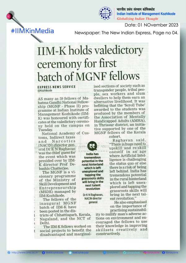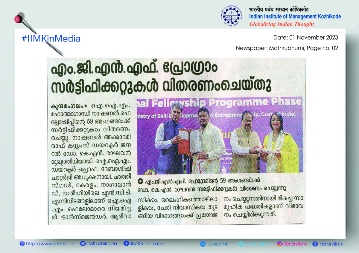 As many as 59 fellows of the Indian Institute of Management Kozhikode’s inaugural batch of the Mahatma Gandhi National Fellowship (MGNF – Phase II) ) programme at Indian Institute of Management Kozhikode (IIMK) was honoured with certificates at the valedictory ceremony held on the campus on Tuesday