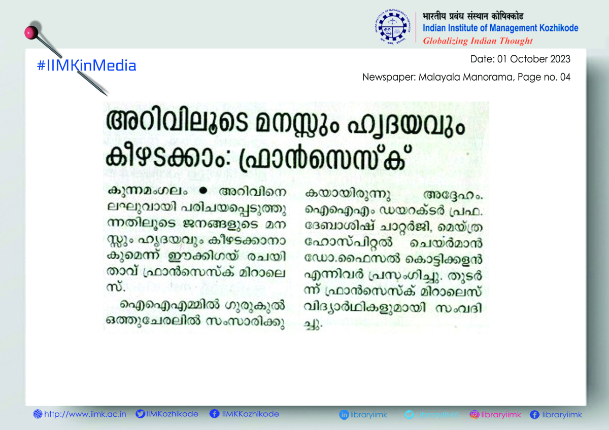 The Indian Institute of Management Kozhikode hosted celebrated author of the best-selling international book “Ikigai” - Mr Francesc Miralles, at the Institute here on Friday.