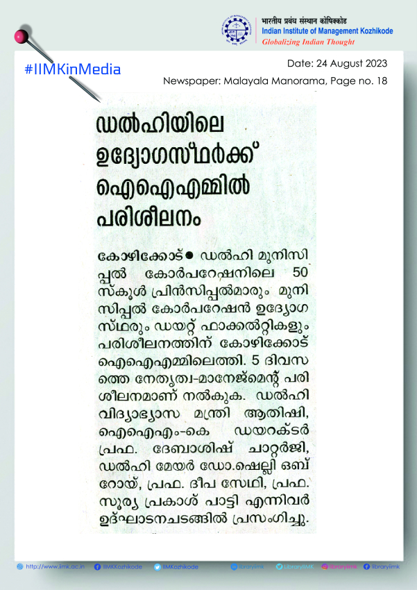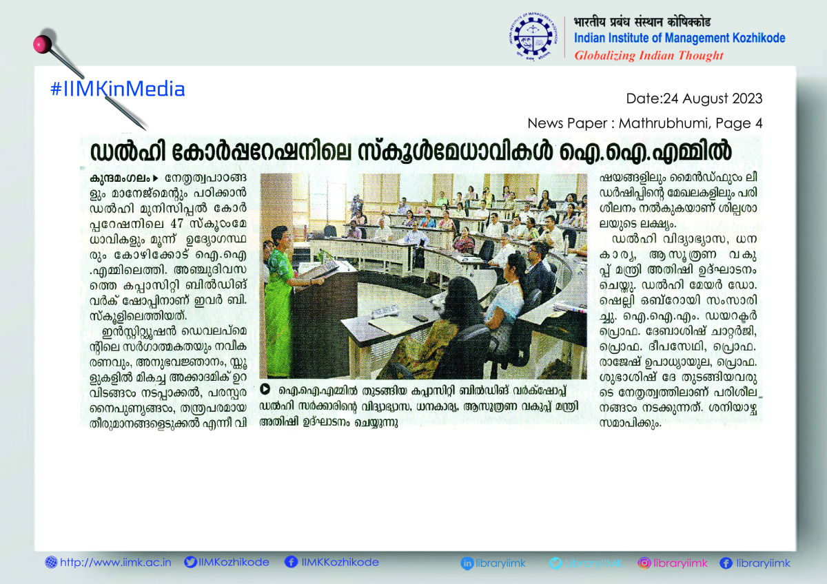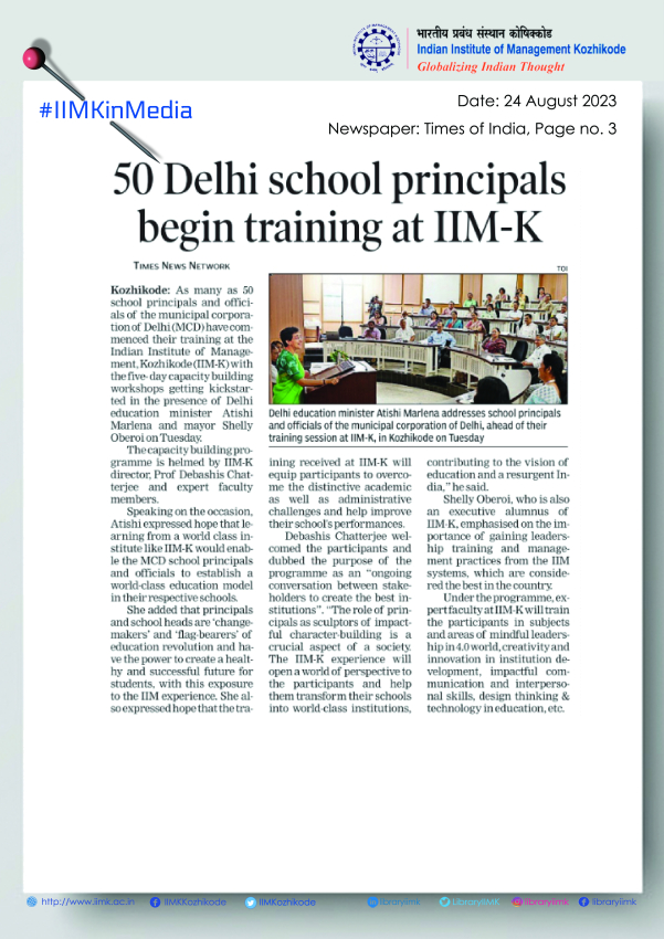 August 23, 2023, Kozhikode: In a significant development IIM Kozhikode has tied up with the Govt, of NCT of Delhi to train the next generation of school principals and officials of the Municipal Corporation of Delhi (MCD). 50 Heads of Schools from MCD, District Institute of Education & Training (DIET) faculty and officials joined IIMK this week to undergo a rigorous 5-day Capacity Building Programme helmed by Director IIM Kozhikode Prof. Debashis Chatterjee and expert faculty members. The Programme was kick-started in the presence of Ms. Atishi, Hon’ble Minister for Education, Finance and Planning, Government of NCT of Delhi and Dr. Shelly Oberoi, Mayor of Delhi.