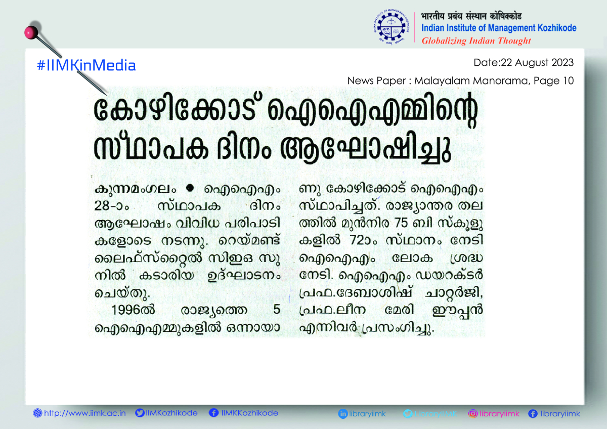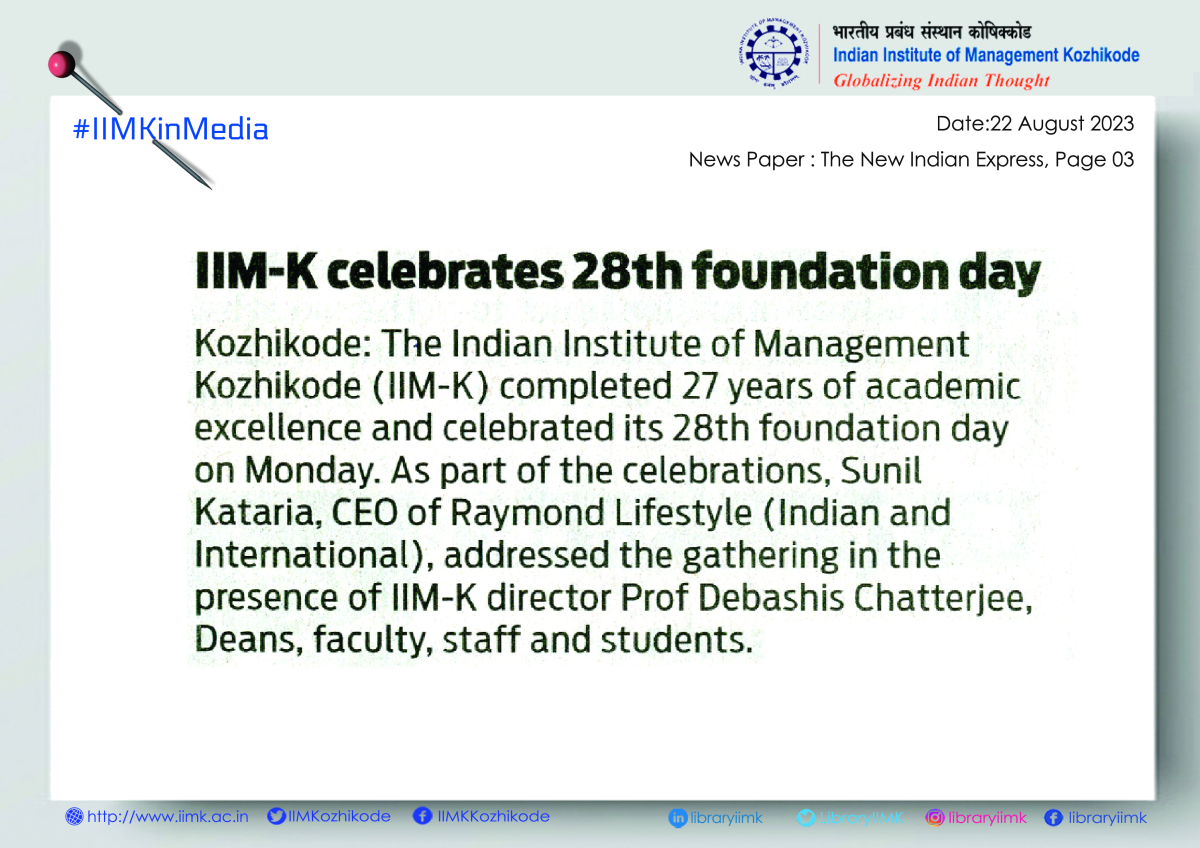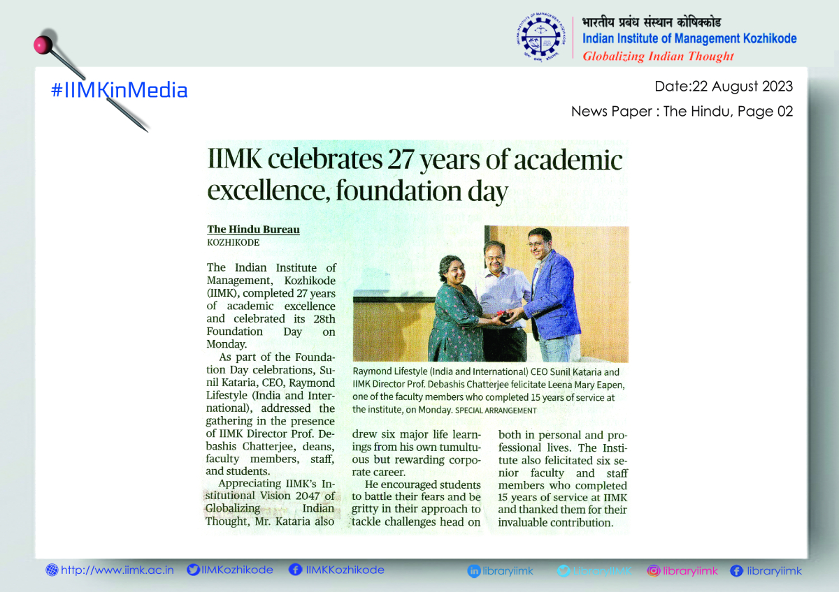 The Indian Institute of Management, Kozhikode (IIMK), completed 27 years of academic excellence and celebrated its 28th Foundation Day on Monday. As part of the Foundation Day celebrations, Sunil Kataria, CEO, Raymond Lifestyle (India and International), addressed the gathering in the presence of IIMK Director Prof. Debashis Chatterjee, deans, faculty members, staff, and students.
