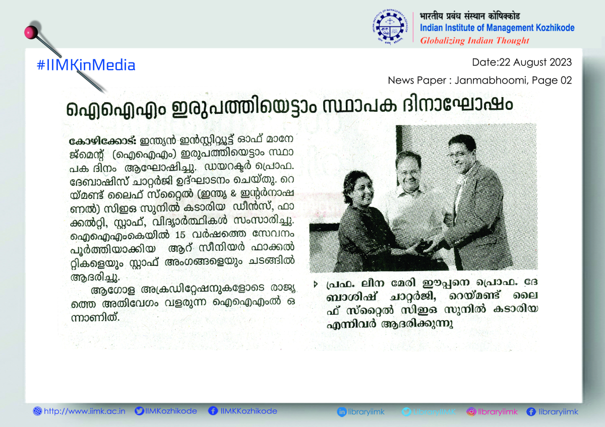 August 21, 2023, Kozhikode: The Indian Institute of Management Kozhikode (IIMK) completed Twenty-seven years of academic excellence and celebrated its Twenty-eighth Foundation Day, here on Monday. As part of the Foundation Day celebrations Mr. Sunil Kataria, CEO Raymond Lifestyle (India & International) addressed the gathering in the presence of Director IIMK, Prof. Debashis Chatterjee, Deans, faculty, staff and students.