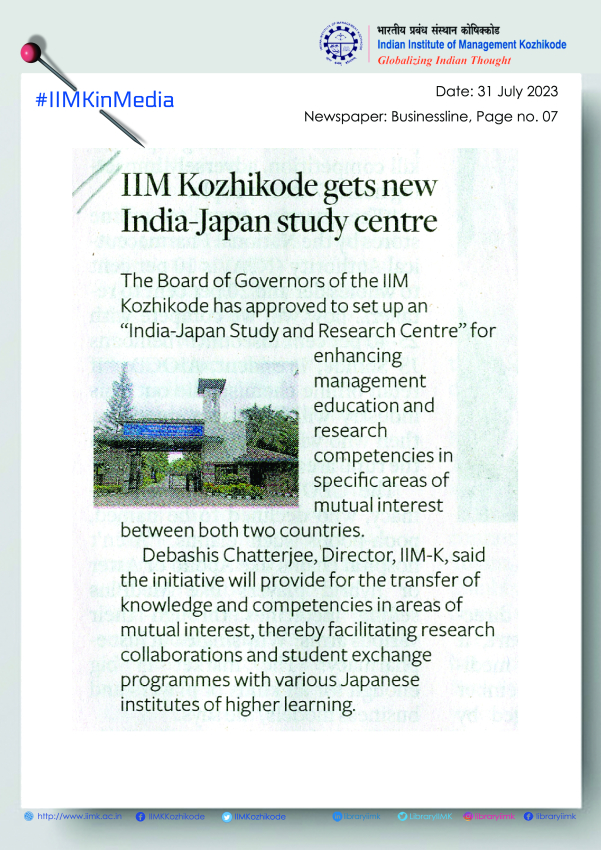 The Board of governors of the Indian Institute of Management, IIM Kozhikode, has given a nod to the proposal of establishing an India-Japan Study and Research Centre for enhancing management education and research competencies in specific areas of mutual interest between both countries.