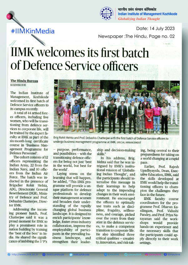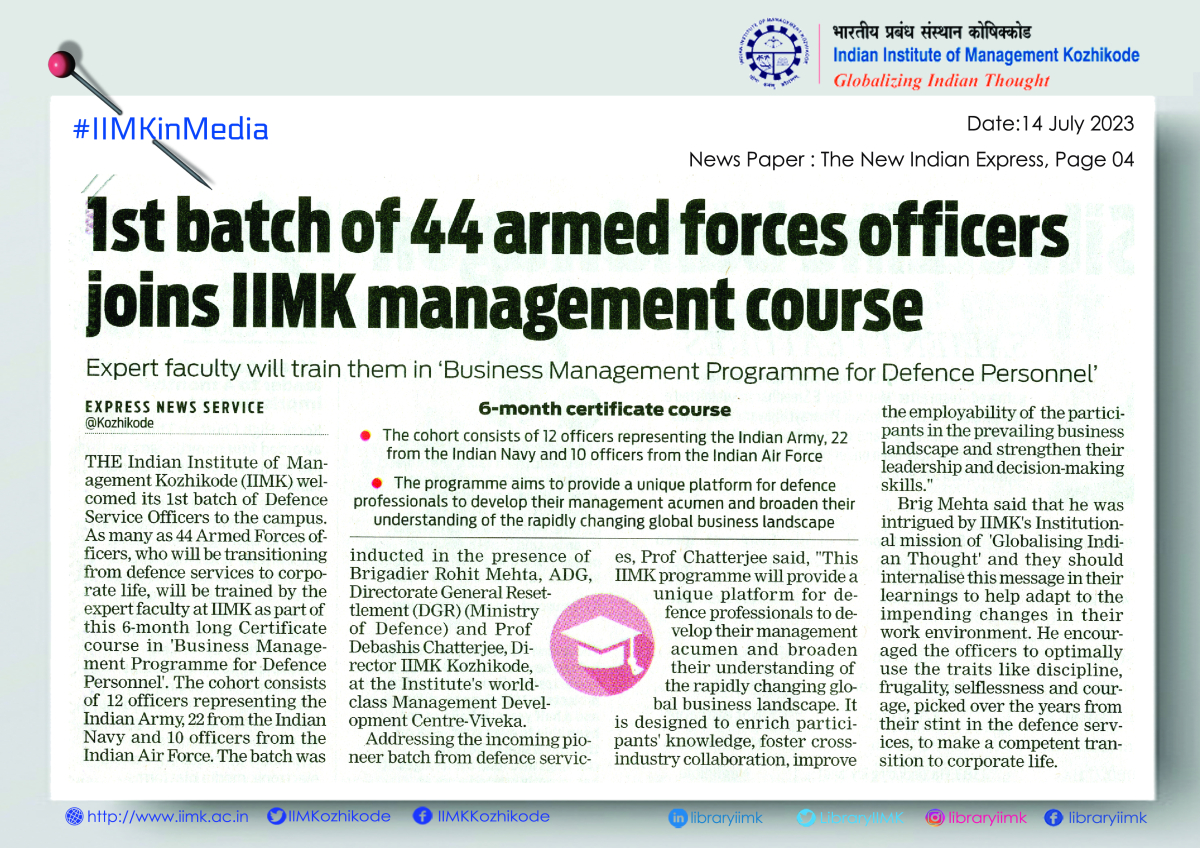 The Indian Institute of Management Kozhikode(IIMK) welcomed its first batch of Defence Service Officers to the campus as many as 44 armed forces officers, who will be transitioning from defence services to corporate life, will be trained by the expert faculty at IIMK as part of this 6-mont long certificate course in 'Business Management programme for Defence Personnel'.