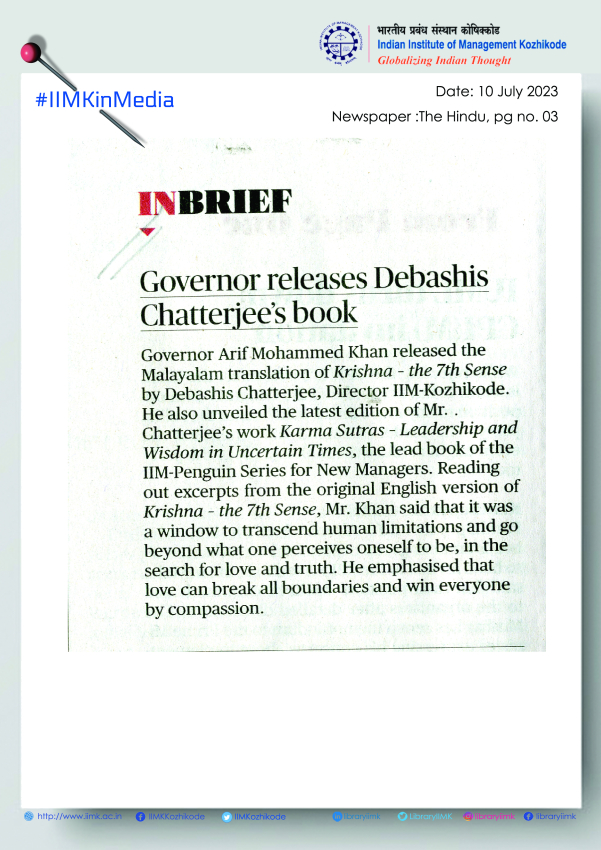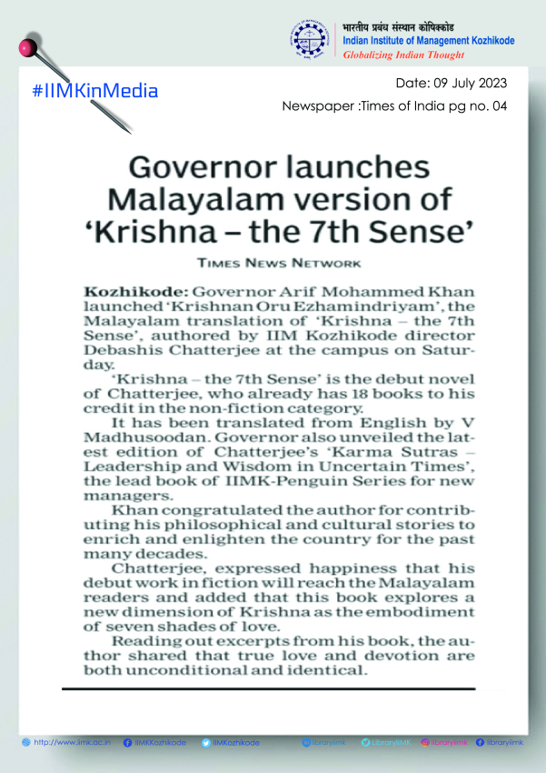 Governor Arif Mohammed Khan launched 'Krishna Oru Ezhamindriyam', the Malayalam translation of Krishna – the 7th Sense authored IIM Kozhikode director Debashis Chatterjee at the campus on Saturday.