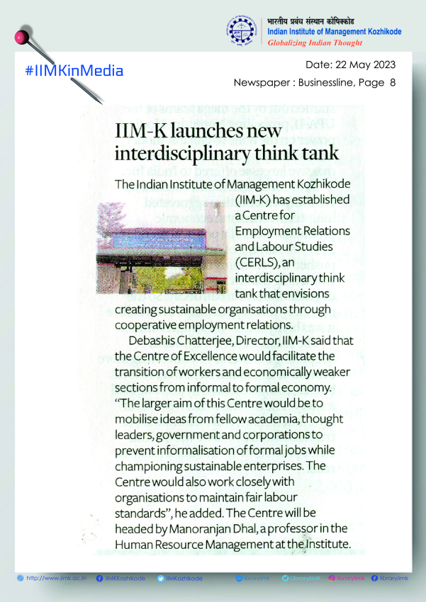 The Indian Institute of Management, Kozhikode has established a Centre for Employment Relations and Labour Studies (CERLS), an interdisciplinary think tank that envisions creating sustainable organization through cooperative employment relations