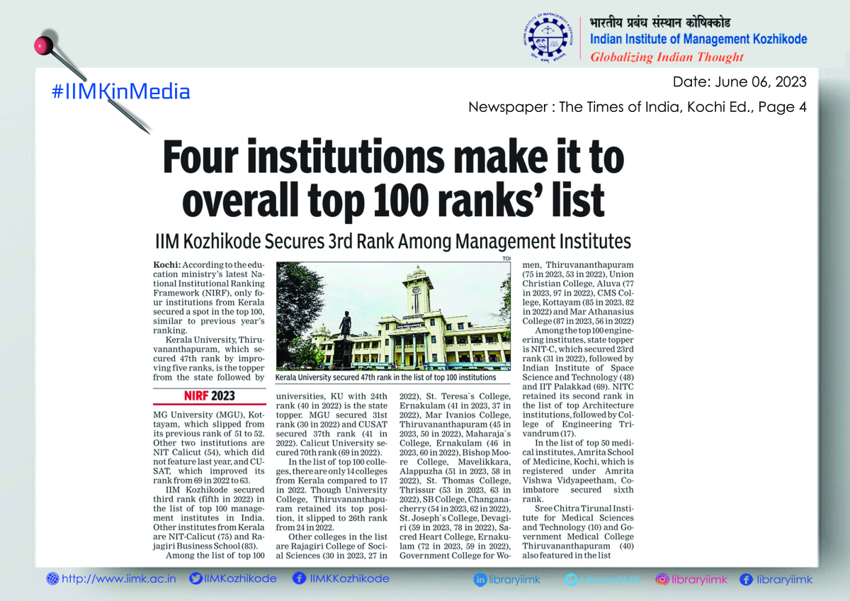 According to the education ministry’s latest national institutional rankings framework(NIRF), only four institutions from Kerala secured a spot in the top 100, similar to previous year’s ranking.