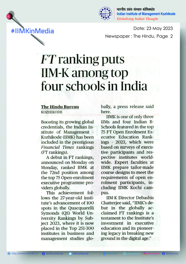 Boosting its growing global credentials, the Indian Institute of Management - Kozhikode (IIMK) has been included in the prestigious Financial Times rankings (FT rankings). A debut in FT rankings, announced on Monday on Monday, ranked IIMK at the 72nd position among the top 75 Open-enrolment executive programme providers globally.