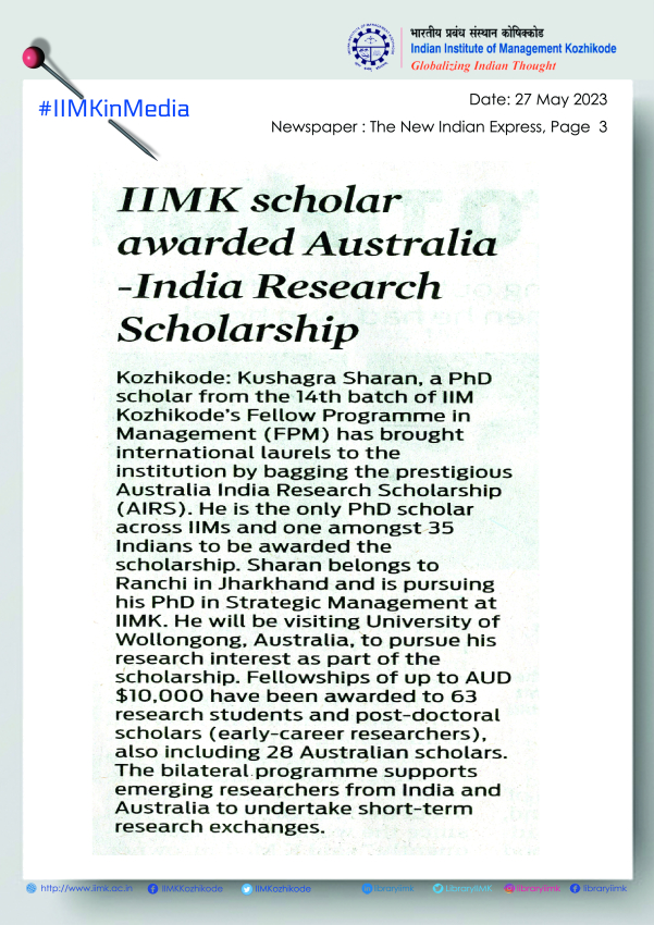 Kusagra Sharan, a PhD scholar from the 14th batch of IIM Kozhikde’s Fellow Programme in Management(FPM) has brought international laurels to the institution by bagging the prestigious Australia India Research Scholarship (AIRS).