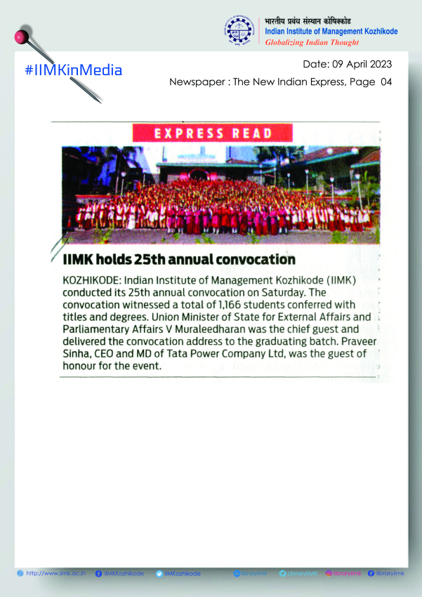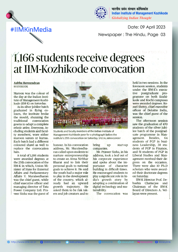 Indian Institute of Management Kozhikode (IIM-K) conducted 25th annual convocation on Saturday. The convocation witnesses a total of 1,166 students conferred with titles and degree