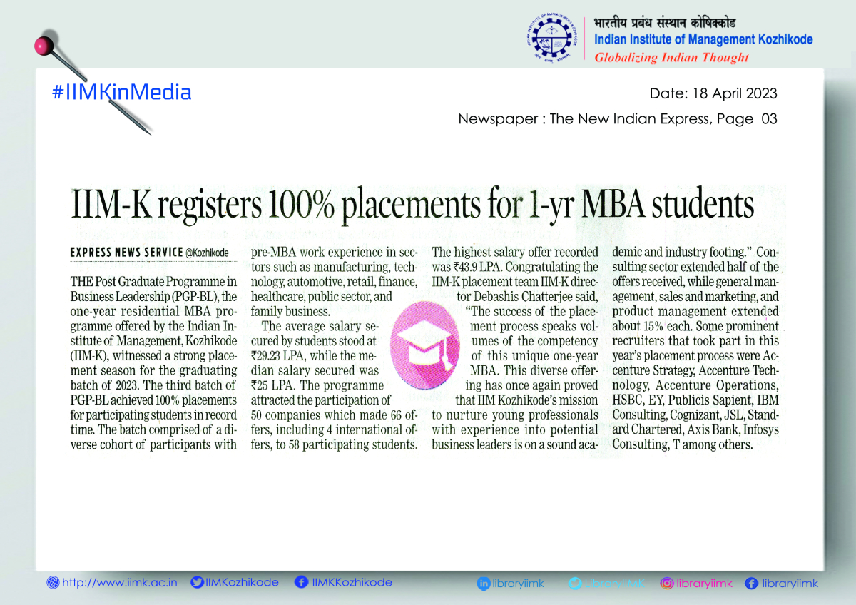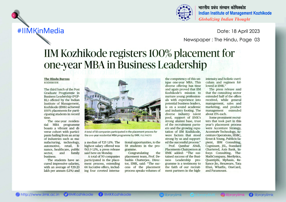 The Post Graduate Programme in Business Leadership (PGP-BL),the one-year residential MBA programme offered by Indian Institute of Management, Kozhikode(IIM-K),witnesses a strong placement season for the graduation bath of 2023