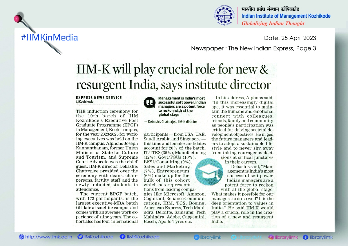 The induction ceremony for the 10th bath of IIM Kozhikode's Executive Post Graduate programme(EPGP) in management, Kochi campus, for the year 2023-2025 for Woking executives was held on the IIM-K campus