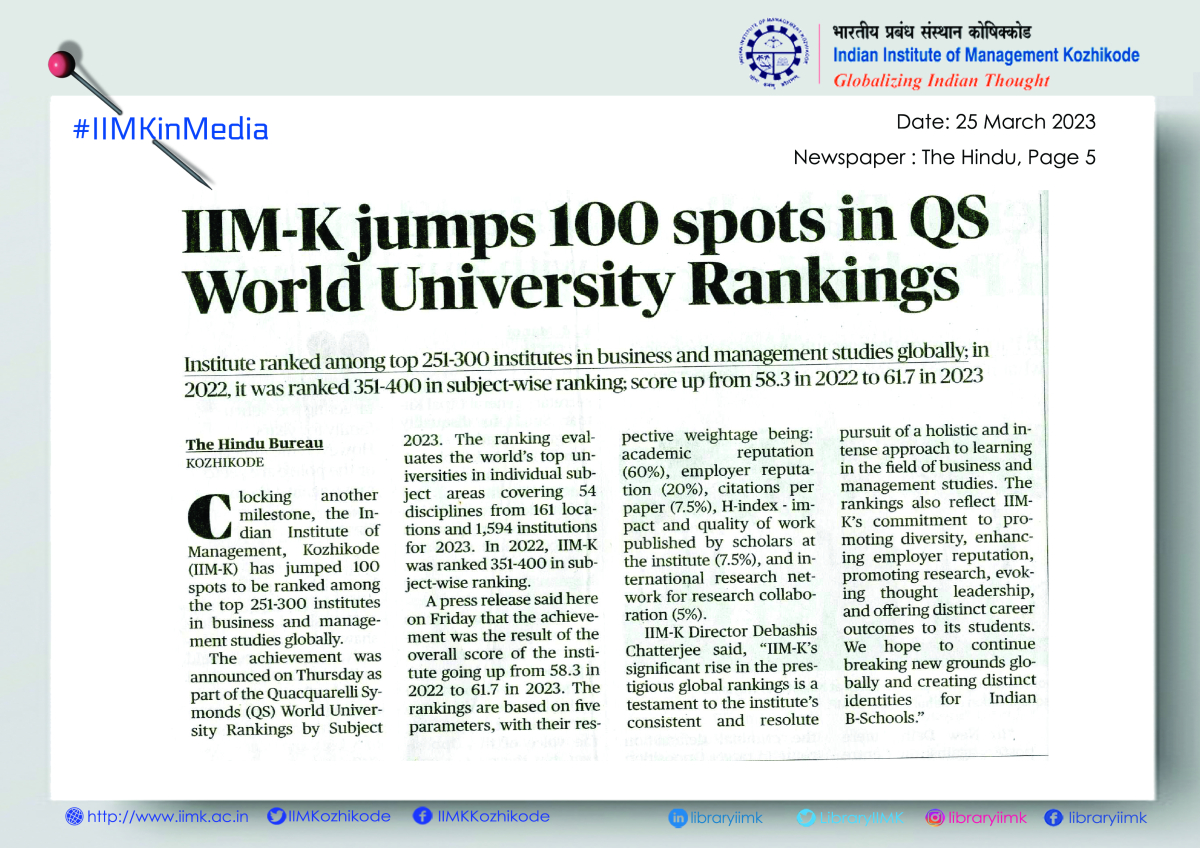 Clocking another milestone, the Indian Institute of Management, Kozhikode (IIM-K) has jumped 100 spots to be ranked among the top 251-300 institutes in business and management studies globally. The achievement was announced on Thursday as part of the Quacquarelli Symonds (QS) World University Rankings by Subject 2023.