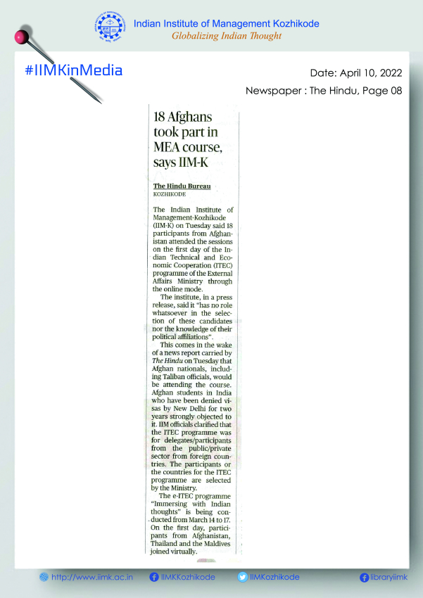 The Indian Institute of Management-Kozhikode (IIM-K) on Tuesday said 18 participants from Afghanistan attended the sessions on the first day of the Indian Technical and Economic Cooperation (ITEC) programme of the External Affairs Ministry through the online mode.