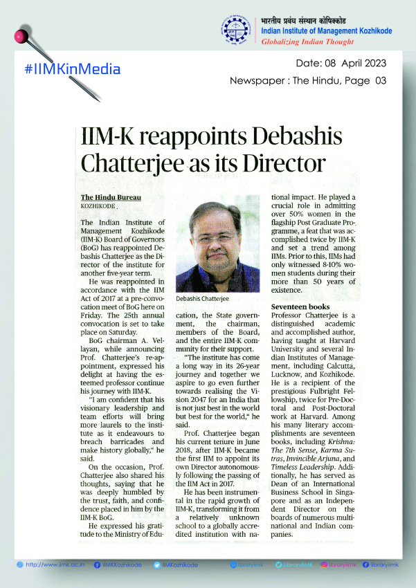 The Indian Institute of Management Kozhikode (IIM-K) Board of Governors (BoG) has reappointed Debashis Chatterjee as the Director of the Institute for another five-year term. He was reappointed in accordance with the IIM Act of 2017 at a pre-convocation meet of BoG here on Friday. The 25th annual convocation is set to take place on Saturday.