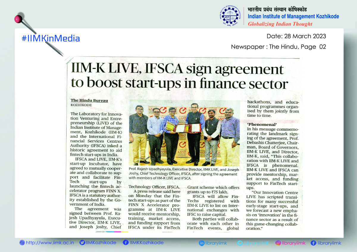 The Laboratory for Innovation Venturing and Entrepreneurship (LIVE) of the Indian Institute of Management, Kozhikode (IIM-K) and the International Financial Services Centres Authority (IFSCA) inked a historic agreement to aid fintech start-ups in India. IFSCA and LIVE, IIM-K’s start-up incubator, have agreed to mutually cooperate and collaborate to support and facilitate FinTech start-ups by launching the fintech accelerator program FINN X. IFSCA is a statutory authority established by the Government of India.