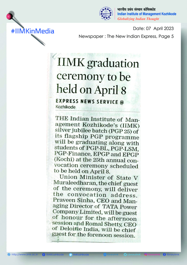The Indian Institute of Management-Kozhikode (IIMK) silver jubilee batch (PGP 25) of its flagship PGP programme will be graduating along with students of PGP-BL, PGP-LSM (Kochi) at the 25th annual convocation ceremony to be held on April 8.