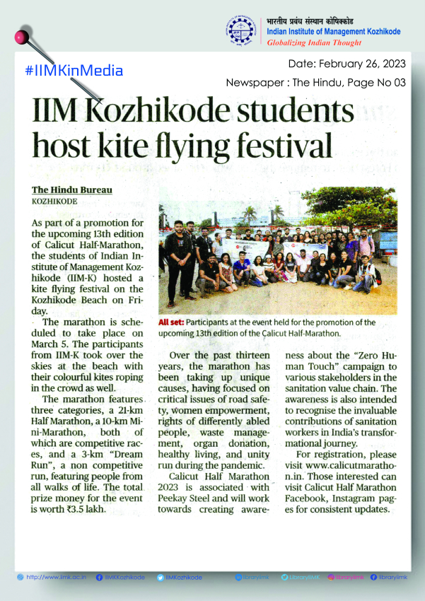 As part of a promotion for the upcoming 13th edition of Calicut Half-Marathon, the students of Indian Institute of Management Kozhikode (IIM-K) hosted a kite flying festival on the Kozhikode Beach on Friday.