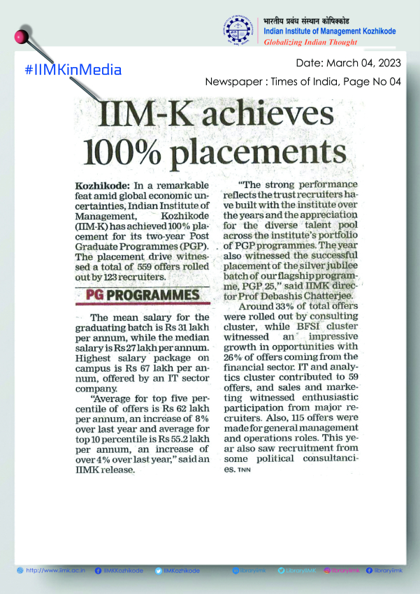 Despite tech layoffs and concerns over global recession, the Indian Institute of Management Kozhikode (IIM-K) witnessed 100% placements for its two-year Post Graduate Programmes (PGP) this season.