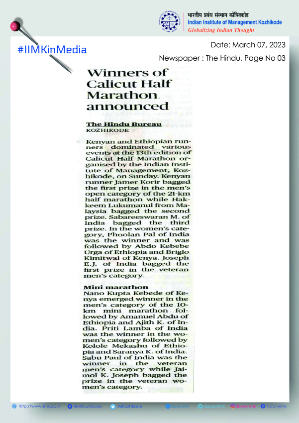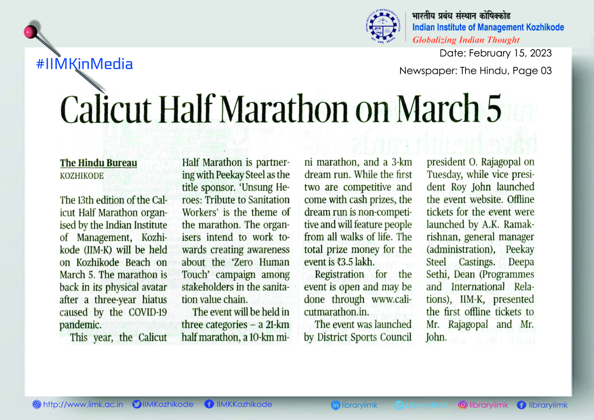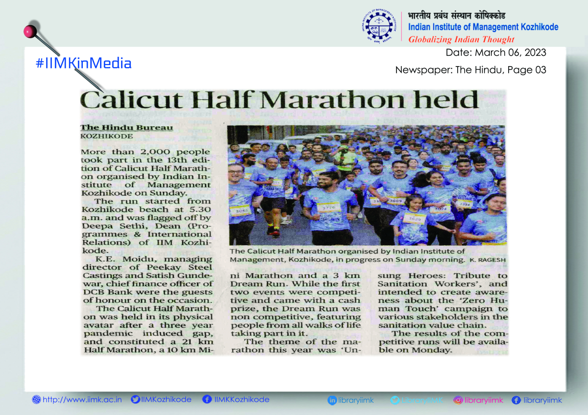 The 13th edition of the Calicut Half Marathon organised by the Indian Institute of Management, Kozhikode (IIM-K) will be held on Kozhikode Beach on March 5. The marathon is back in its physical avatar after a three-year hiatus caused by the COVID-19 pandemic.
