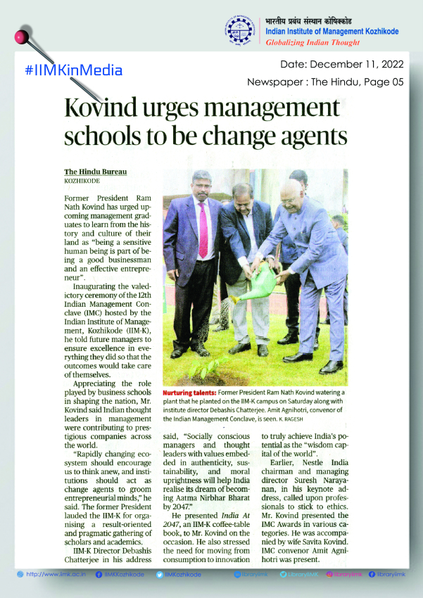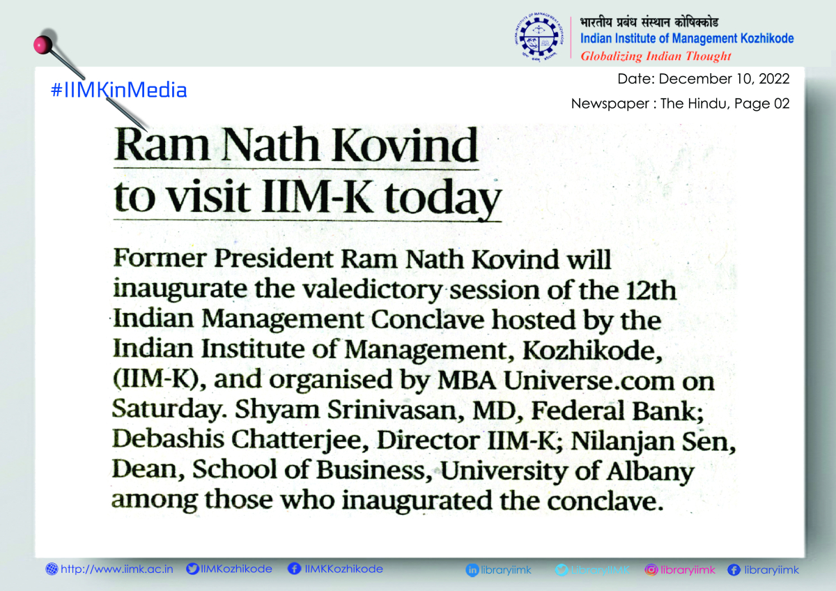 Former President Ram Nath Kovind will inaugurate the valedictory session of the 12th Indian Management Conclave (IMC) hosted by the Indian Institute of Management Kozhikode (IIM-K) and organised by MBA Universe.com at the institute at Kunnamangalam here on Saturday.