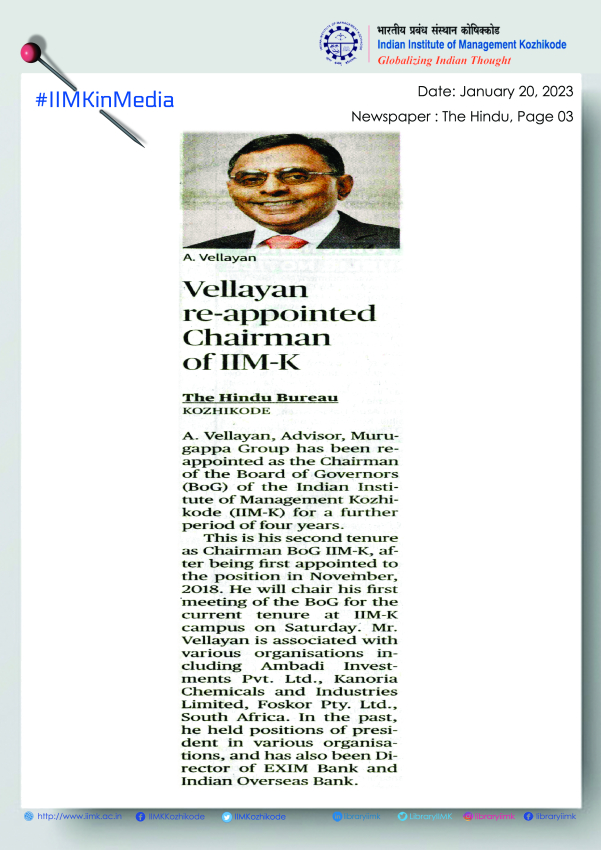 A. Vellayan, Advisor, Murugappa Group has been re-appointed as the Chairman of the Board of Governors (BoG) of the Indian Institute of Management Kozhikode (IIM-K) for a further period of four years.