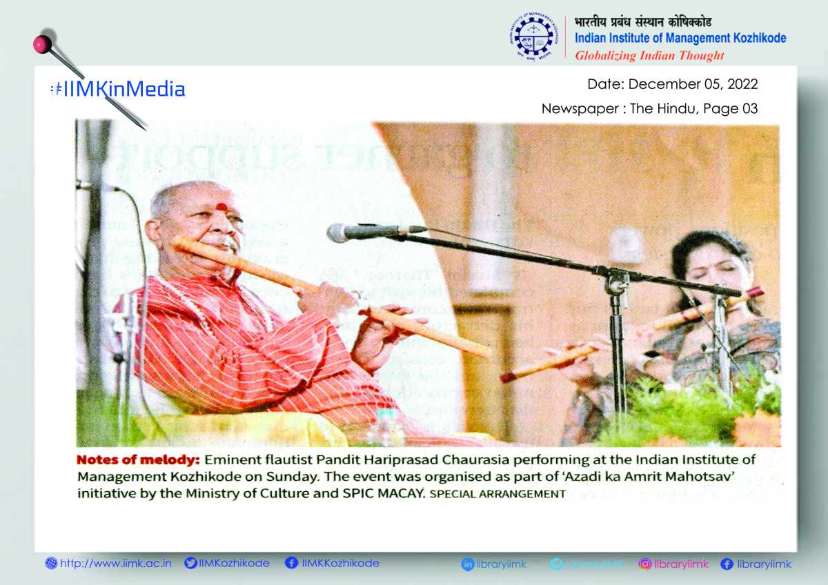 Notes of melody: Eminent flautist Pandit Hariprasad Chaurasia performing at the Indian institute of management Kozhikode on Sunday