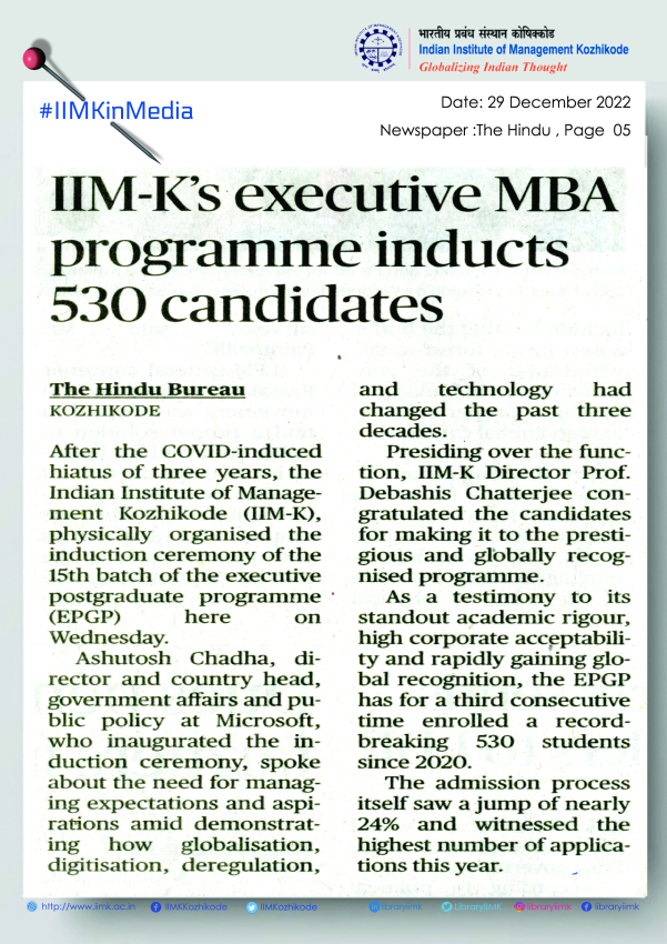 After the COVID-induced hiatus of three years, the Indian Institute of Management Kozhikode (IIM-K), physically organised the induction ceremony of the 15th batch of the executive postgraduate programme (EPGP) here on Wednesday.