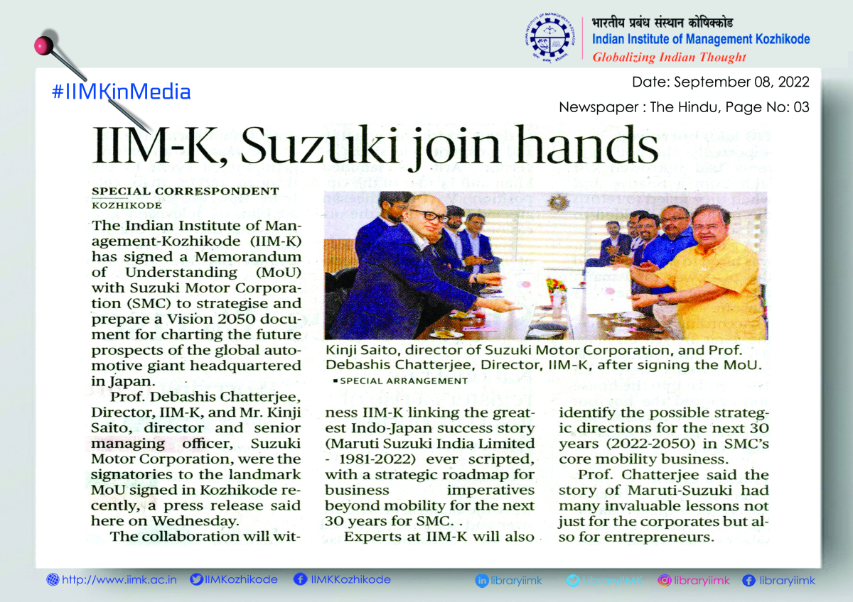 The Indian Institute of Management-Kozhikode (IIM-K) has signed a Memorandum of Understanding (MoU) with Suzuki Motor Corporation (SMC) to strategise and prepare a Vision 2050 document for charting the future prospects of the global automotive giant headquartered in Japan.