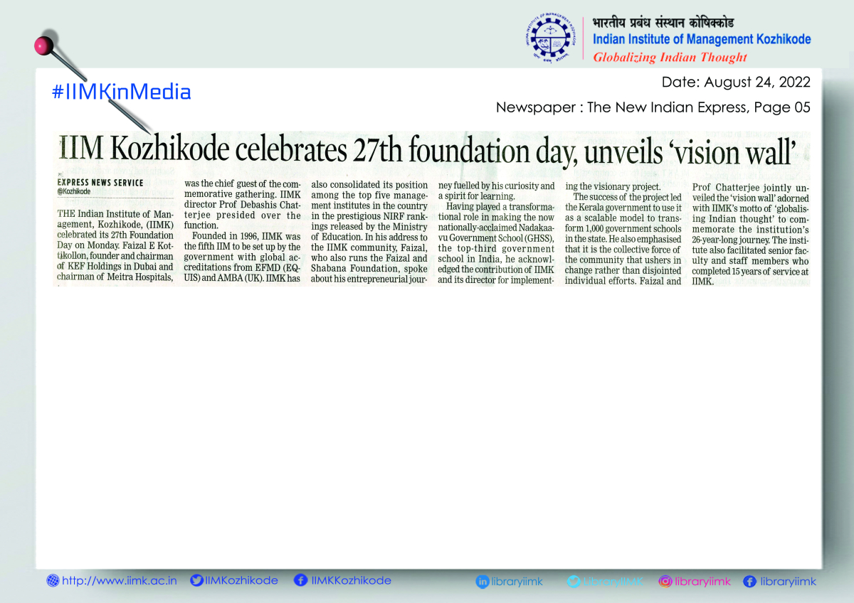 The Indian Institute of Management, Kozhikode, (IIMK) celebrated its 27th Foundation Day here on Monday. Faizal E Kottikollon, Founder and Chairman KEF Holdings in Dubai and Chairman Meitra Hospitals was the Chief Guest of the commemorative gathering. IIMK director Prof. Debashis Chatterjee presided over the function.