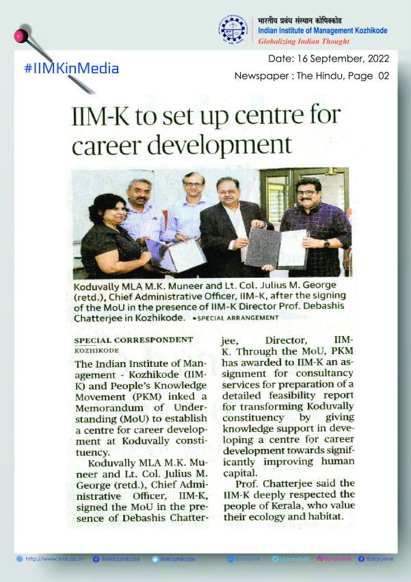 The Indian Institute of Management - Kozhikode (IIM-K) and People’s Knowledge Movement (PKM) inked a Memorandum of Understanding (MoU) to establish a centre for career development at Koduvally constituency.